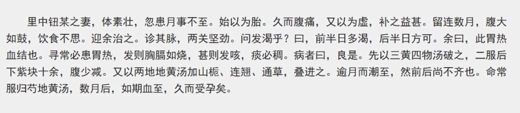 Stomach heat with blood stagnation – Excessive stomach heat causing blood coagulation and menstrual blockage.