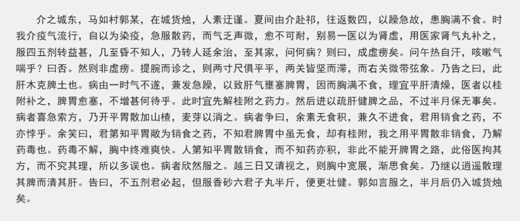 In Maru Village east of Jiexiu City, there was a candle merchant named Guo. He was known for his rigid and anxious personality. During one summer, he traveled frequently between Jiexiu and Qi County. Due to his hurried schedule and irritable mood, he developed chest tightness and loss of appetite. At the time, an epidemic was spreading in Jiexiu, so Guo believed he had contracted the disease. He hastily took anti-epidemic herbal powder, but this worsened his condition, leaving him weak and breathless.